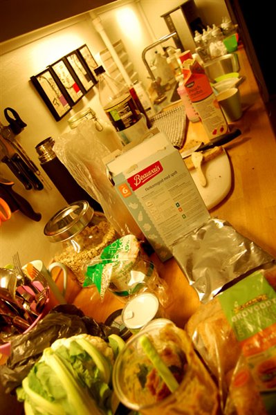 her et billede af køkkenet efter en normal dag med bøtter. det skal ud og ordnes NU!