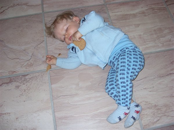 Det er da et fantastisk billede, hvor han er faldet i søvn midt i en bid kiks...............og så på et klinkegulv. Så er man da vist træt.