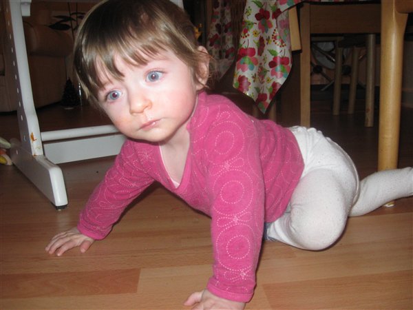 Hun er også begyndt at trække det ene ben ind under sig, når hun står i "hunde"stilling, og prøver at komme om på numsen.