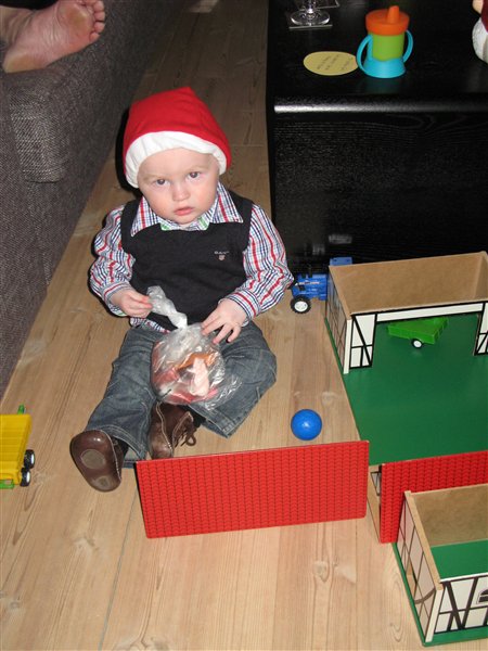 Sjovt nok så har vi haft svært ved at få en nissehue på Niklas Emil hele december måned. Hver gang vi har givet ham den på flåede han den af med det samme, men netop juleaften sagde han ikke noget til at have den på så det var jo bare perfekt