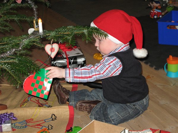 Vi lod børnemusikken køre i baggrunden og begyndte så gaveracet. Niklas Emil var godt tilfreds med sine gaver. Han legede straks med det hele. Han hyggede sig bare rigtig meget. Til sidst satte han sig hen til træet og kiggede nærmere på alt pynten. Det var bare så sødt for han sad bare lige så stille og mærkede på de forskellige ting. Han ødelagde ikke noget!