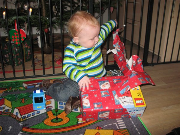 Min mor og jeg måtte så holde stemningen oppe og gøre det hele klar. Vi hyggede os med Niklas Emil som var i rigtig god humør hele dagen. Han fik allerede en af sine julegaver den 23. og igen en om dagen den 24. Ikke fordi jeg er tilhænger af det med at børn får julegaver før tid, men fordi han simpelthen aldrig ville nå igennem sine gaver om aftenen så hvorfor ikke tyvstarte lidt når han alligevel var for lille til at forstå hvad det hele drejede sig om....