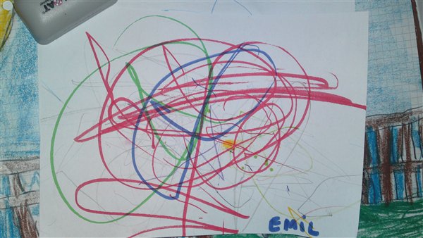 Ej spøg til side, men fik af vide i vuggestuen at Emil er meget god til at tegne og han går meget op i det når de tegner og han kan bare blive ved og ved.