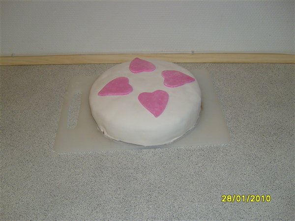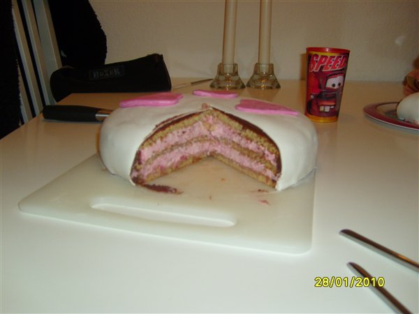 Den er lavet af købe lagkage bunde (lyse) med hindbær mousse, smurt med billig nutella også MMF...