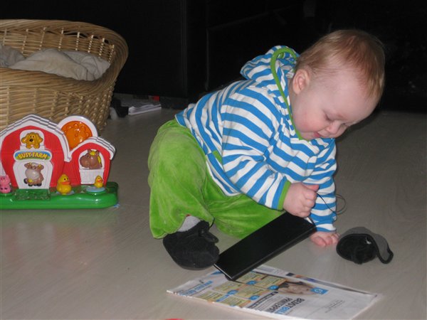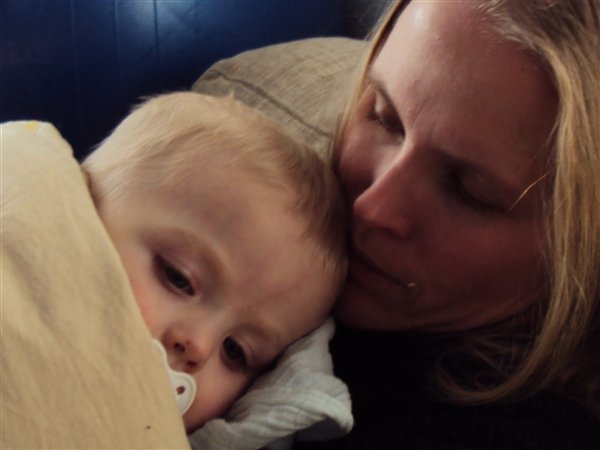 3. Lørdag, sådan hygger vi altid når jeg lige er vågnet - mor siger jeg er en puttefiz.