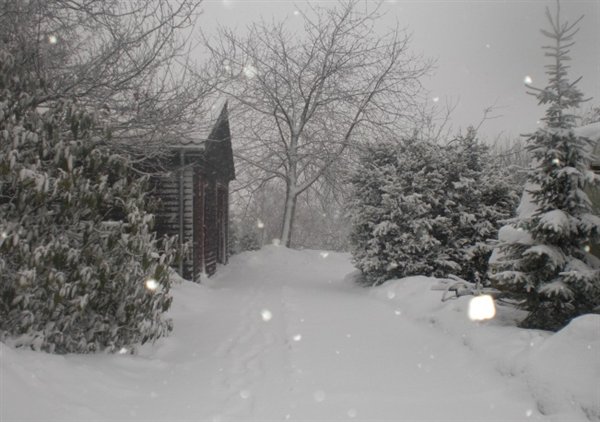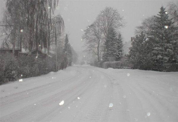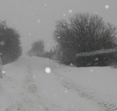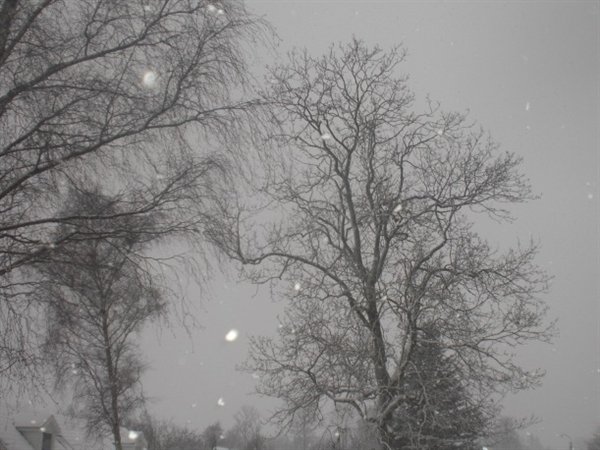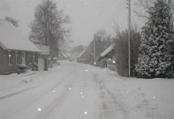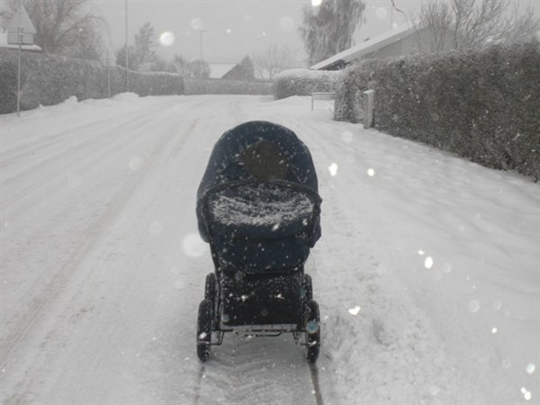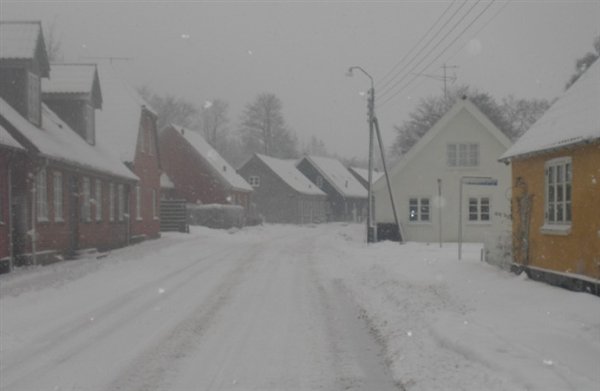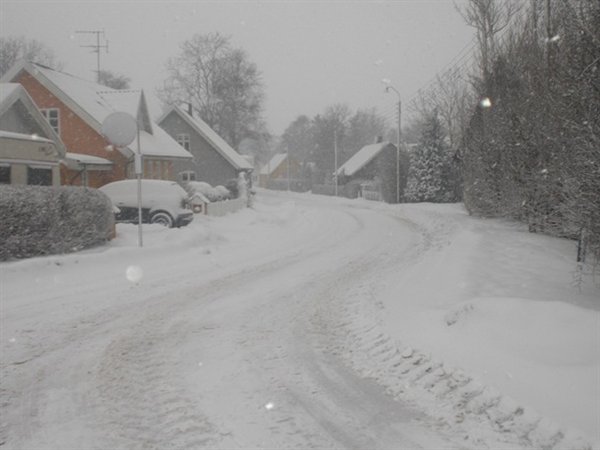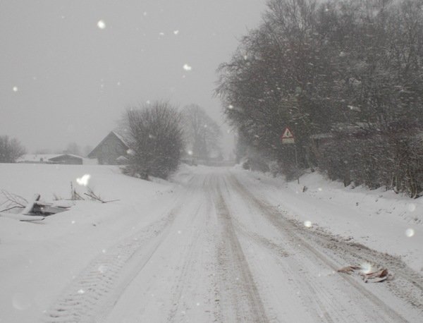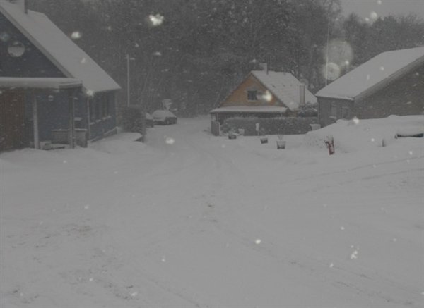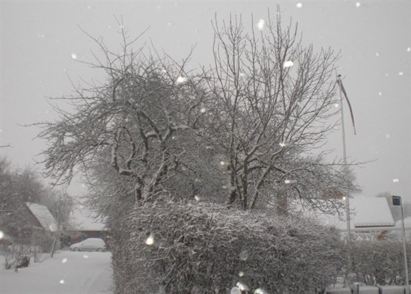 men der er kridhvidt og knæhøjt sne og så så vi lige akkurat nu en sneplovtraktormaskine kører forbi med sneploven SLÅET OP