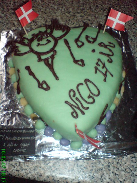 3 kage til nico med hindværmousse og aftereight creme ( den var også okay ) havde skrevet 17 år på den...man fandt udaf efter at han "kun" blev 16 år...så det fik jeg lavet om;-)