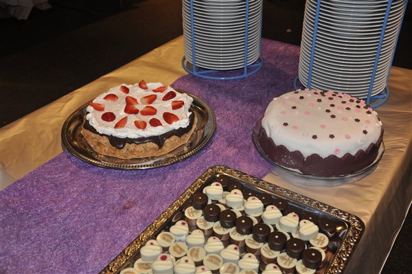 Den hvide MMF-kage med de rosa og lille blomster på er vores, der er 4 lag i: skilpaddecreme, skovbærmousse, tobleronecreme og hindbærmousse.