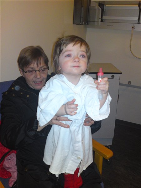 Kl.08.50 kom vi ned på OP, mig i det smarte out-fit... Malucca sov sødt kl. 9.00, kl. 10.10 blev jeg endelig hentet, at nu havde de langt om længe fået vækket min lille mus. (-og jeg var blevet MEGET nervøs på det tidspunkt) Da jeg kom ned, kom lægen med Malucca i armene, -og hun skreg som en stukken gris.