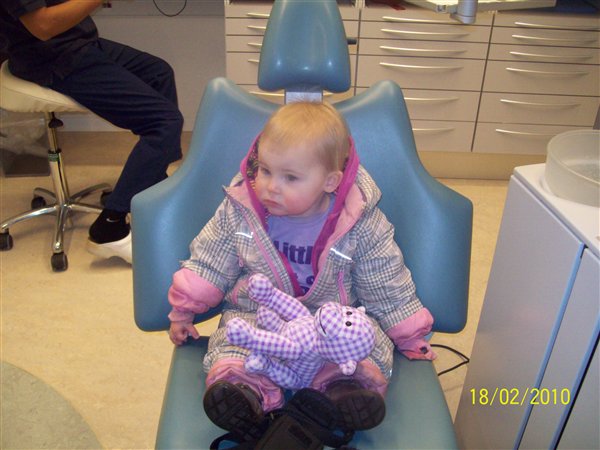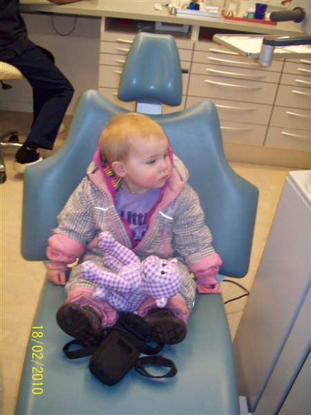 Det gik helt fint, Cassandra sagde ikke et pip over at tandlægen skulle kigge på hendes tænder. Hun åbnede pænt munden. Hun sad i stolen da tandlægen lagde den ned og det synes hun var sjovt. Hun har fine og flotte tænder. Ja da Cassandra så være færdig og kommet ned af stolen, så skulle hun lige ind i et andet rum, og trykkede på knappen der ligger stolen ned, for det havde hun jo set tandlægen gøre. Heldigvis var den slukket, ellers havde hun fået stolen i hovedet. Skøre pige.