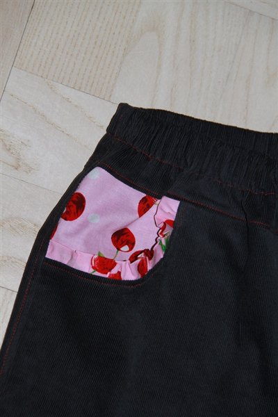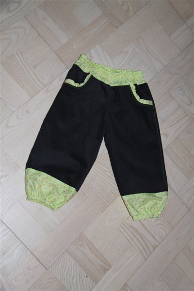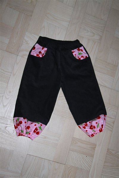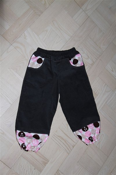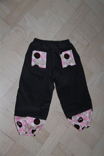 Nu hvor hun er str. 86/92 og er meget aktiv regner jeg med at hun er ved at hun kan passe det i et stykke tid - så er der lidt mere ved at bruge tiden på at sy lækkert tøj som ikke alle andre har. Det tager ca. 4 timer at klippe og sy sådan et par bukser her, da alting skal være så præcist og der er 7000 km pyntestikninger på dem, så det er ikke ligefrem nogen god forretning... Til gengæld er det en fed fornemmelse at se hende i dem.