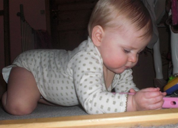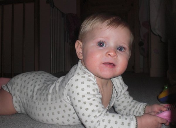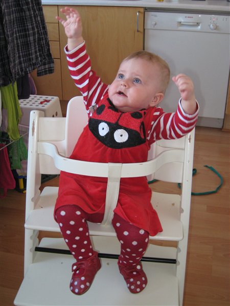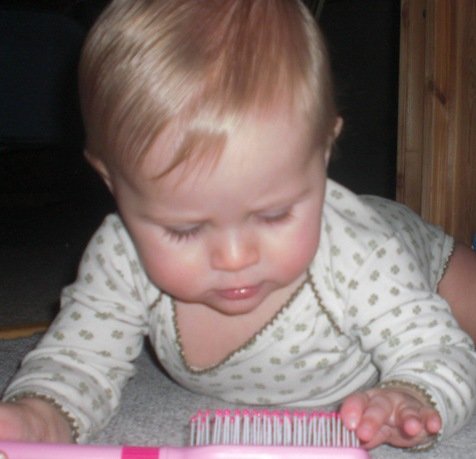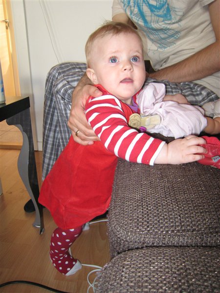 Okay Katrine, der er eddermame skræmmende - bortset fra problemerne med rugbrødshapserne, så har du 100% beskrevet Lina!! Hun kommer nu også rundt på samme måde som Celina, tager endnu ikke kravletag men står på alle fire og rokker og får bevæget armene - hun kan dog ikke komme op på knæ at stå andet end i badekarret