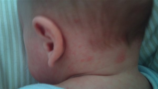 Han har små røde knopper, flest i nakken og i panden, men også på kinder, og nu er de også begyndt at komme på hals og brystet... Nogen der har en idé??