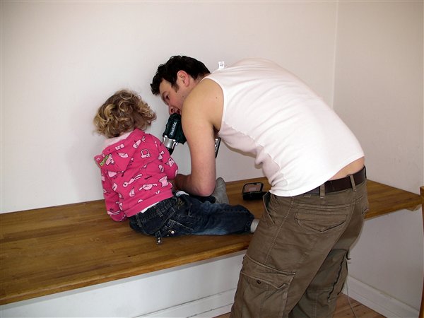 Imorgen skal der købes bordplade og hylder som skal hænge over bordet.