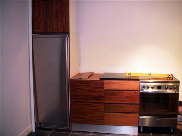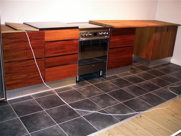 Det er slet ikke færdigt endnu, men det går den rigtige vej. Min stedfar har lavet hul til em-hætten idag, så den skal sættes op i aften.... og så mangler der lige at blive sat vand og el til..... der skulle jo laves hul i gulvet, til at trække vandrør op osv....