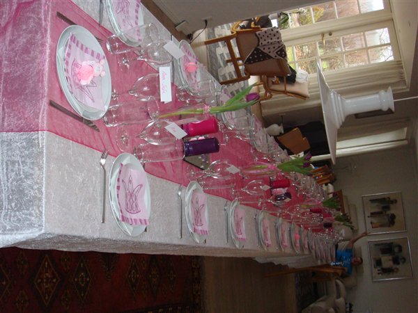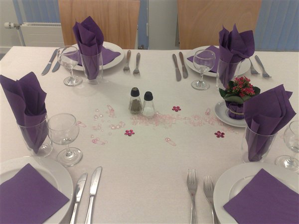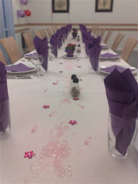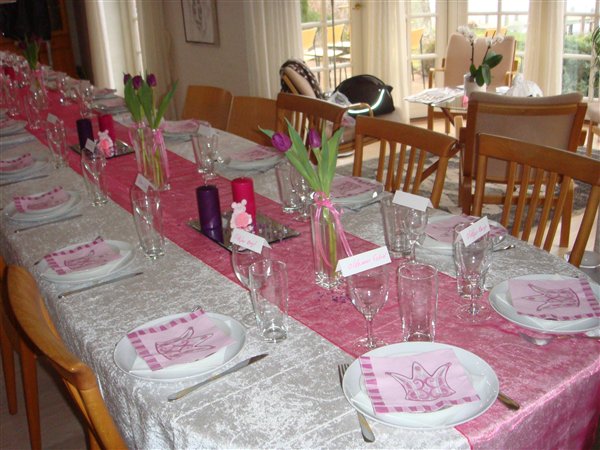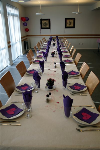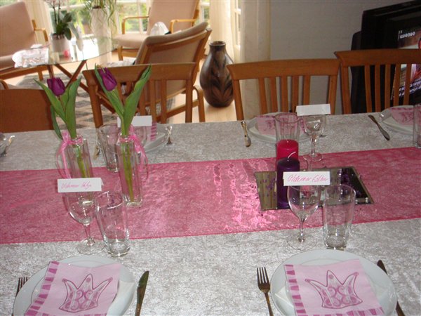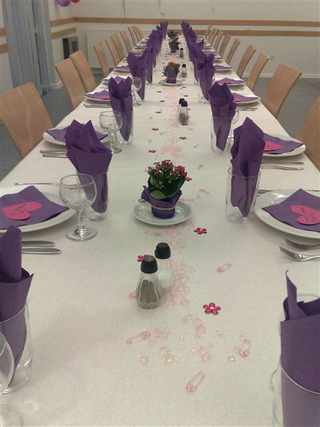 Vi brugte blandet lilla og lyserød, dekosten drysset på bordet, og deko "diamant" blomster strøet, små sikkerhedsnåle også strøet og så købte jeg simpelthen bare lyserød pap klippede dem ud som hjerter og skrev med en flot sølvtusch på, og det blev navneskilte ..