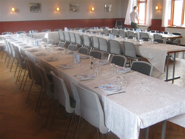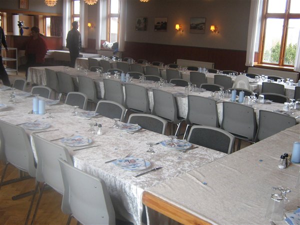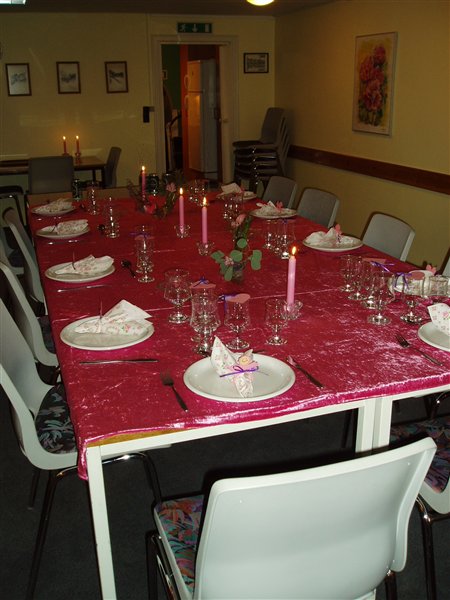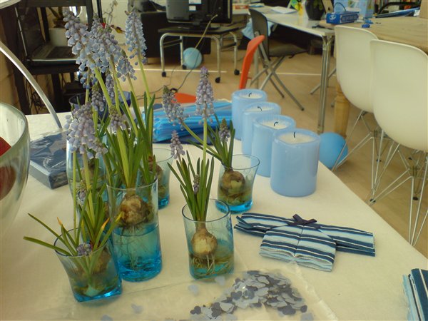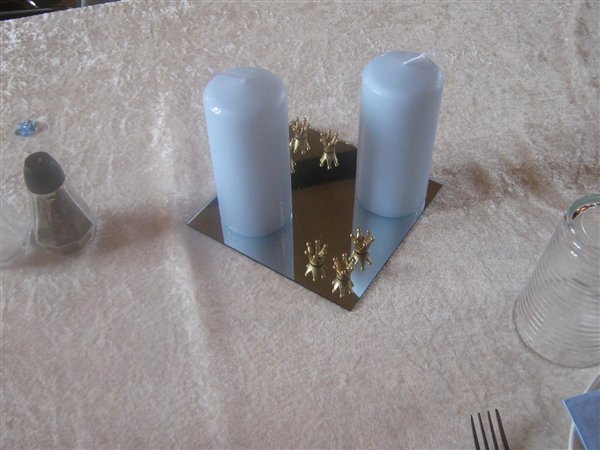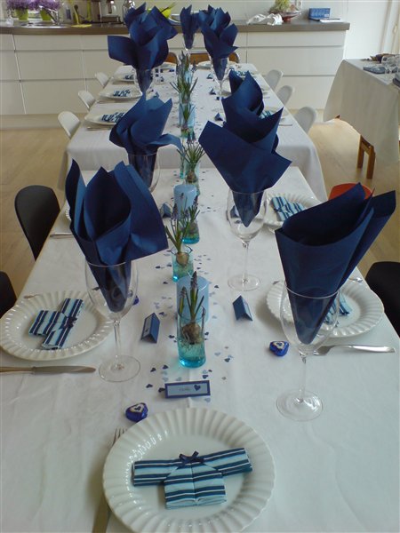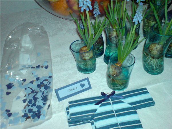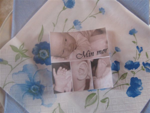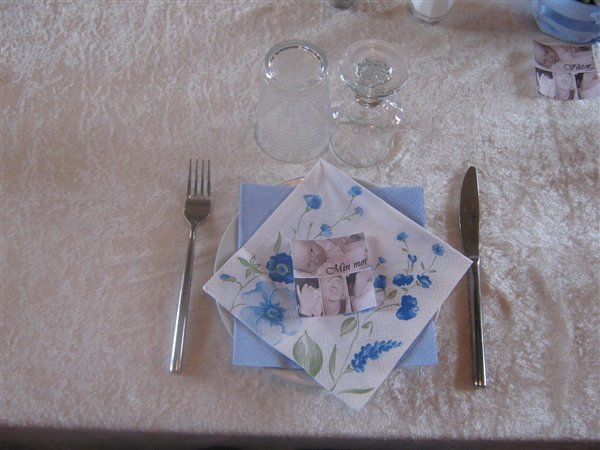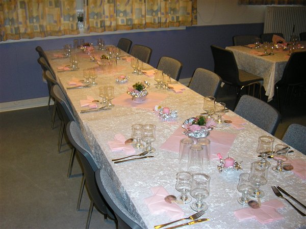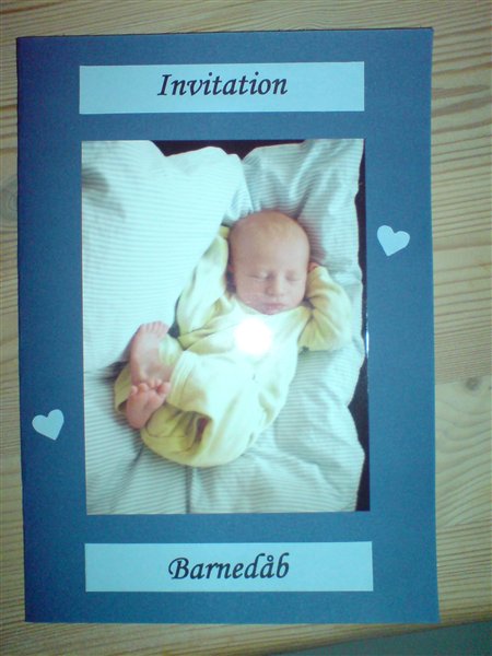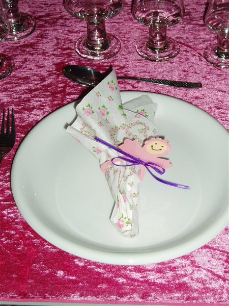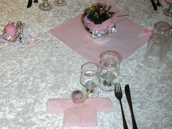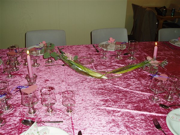 Jessica var 6 måneder da hun blev døbt... invitationer fik vi aldrig lavet da familien var så lille, men borddækningen var; pink velourdug, hjemmelavede serviet ringe og bordkort (ser ud som servietringene) og aflange vaser med enkelte blomster i...