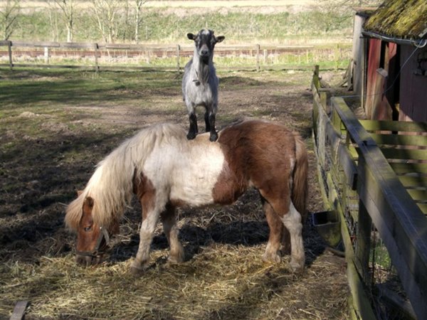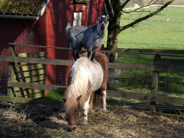De står et par kilometer fra vores hjem. En dag vi var ude og gå en tur med barnevognen, så hoppede geden pludselig op på ryggen af sin gode ven, lille hest, så den kunne få et bedre udsyn over situationen.