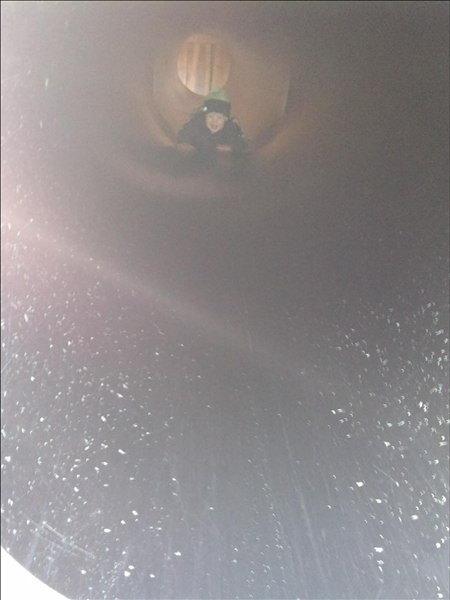 Mor; det er helt okay, han tager selv turen ned gennem rør'et og har prøvet det før...