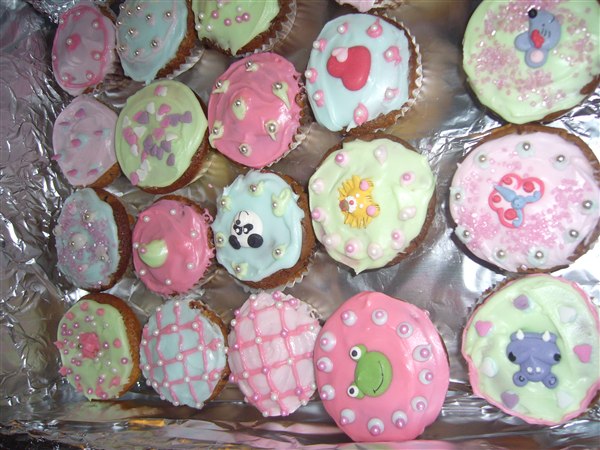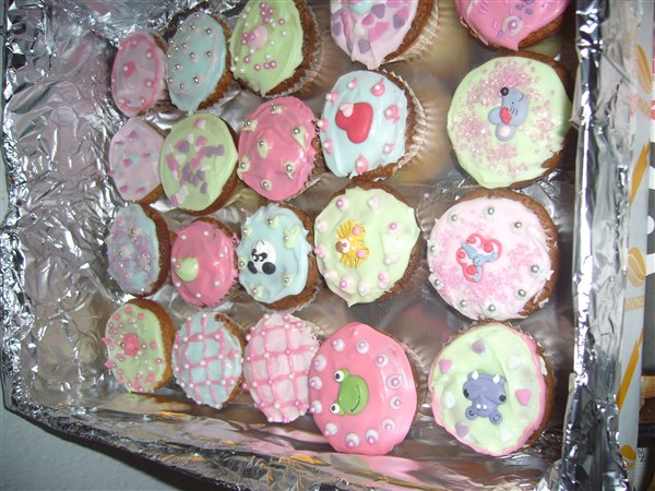 Jeg bagte de her til min datters fødselsdag og de vakte stor begejstring. de er pyntet med æggehvideglasur (flormelis rørt op med pasteuriseret æggehvide) i forskellige farver og så er der brugt pyntefigurer fra føtex. Når jeg kommer det på laver jeg en bundfarve og så har kontrast farver i små poser der er klippet et lille hul i så man kan lave fine snørkler osv