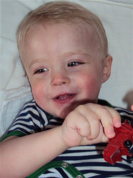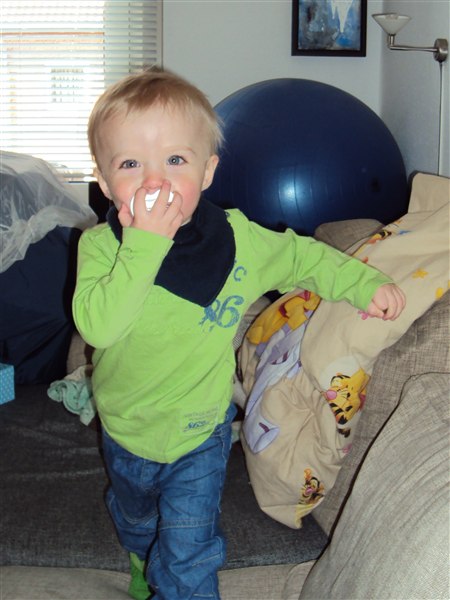 3. ligger lige og får tøj på, med hans lille mejetærsker i hånden.