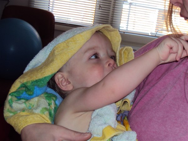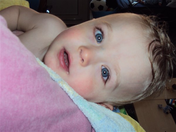 4-6. lige kommet op fra bad - skal vise hvor mors mund er - hej far, elsker at ligge og lege baby...