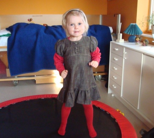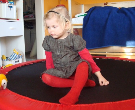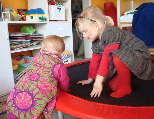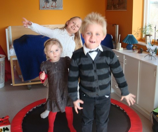 Hopper på trampolin sammen med kusine Victoria og fætter Berthil.