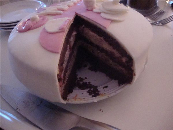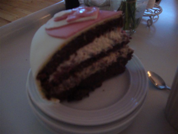 Chokoladekage bunde, med vaniliecreme med hakketchokolade, vaniliecreme med hindbær, smurt med smørcreme med appelsin. MMF på toppen... MUUUUUUUMS!