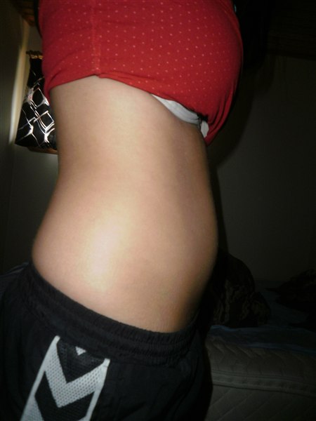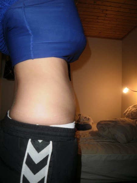 Men hvis jeg er gravid, så burde jeg vist være i 14. uge nu? Min sidste mens var 30. devember. Jeg har altid haft en fast og flad mave. Ikke helt veltrænet, men almindeligt trænet. Nu er den, ja, jeg ved ikke... det er bare ikke min mave jeg har nu. Det er slet ikke min krop længere. Kan ikke genkende den