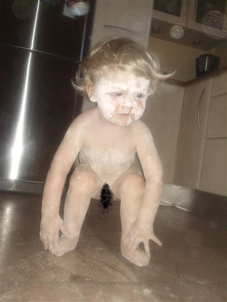 Jeg var ved at tørrestøv af i stuen mens Viktor rendte rundt og luft tørrede efter sit bad.... Hmmm.... Jeg tror så at knægten leger med noget af sit legetøj ude i køkkent fordi han morer sig højlydt...