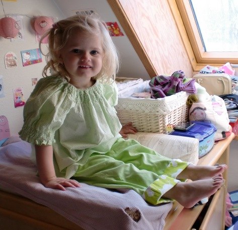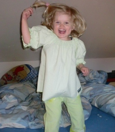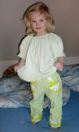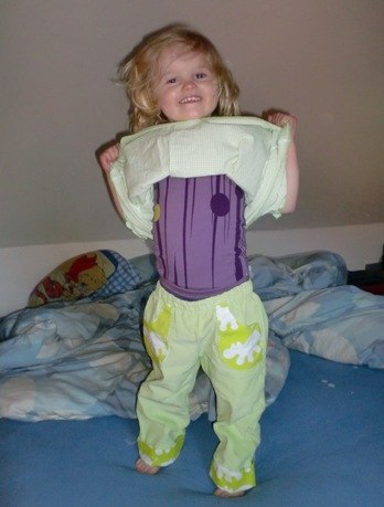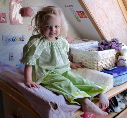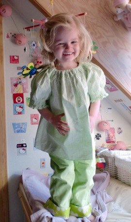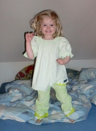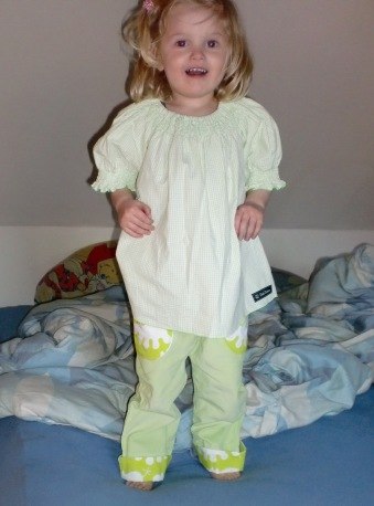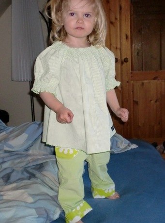 Celina kan liiige nøjagtigt passe bukserne, men tunikaen er for stor til hende. Til gengæld passede den Bianca godt. og Bianca's tunika må nok lige vente en måned eller to, før den passer. Bukserne passede også Bianca. Og jeg synes de ser drøn godt ud i dit smarte DAUB DELUXE modetøj