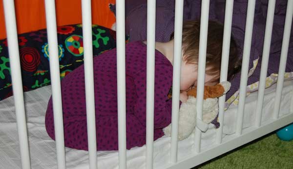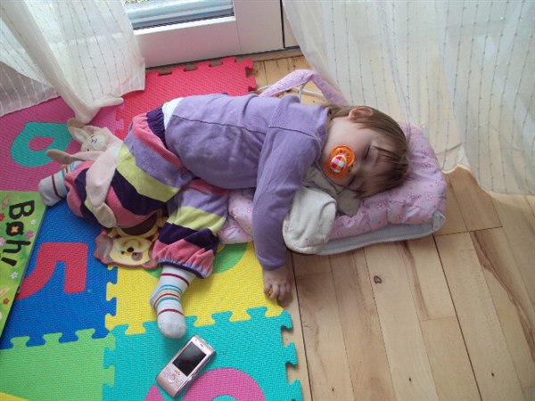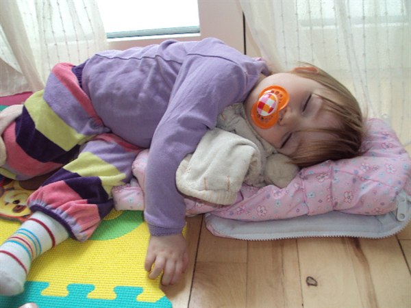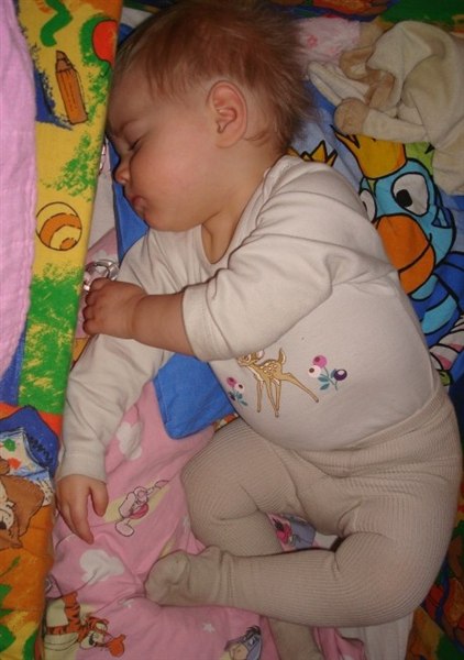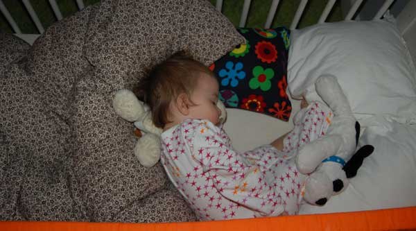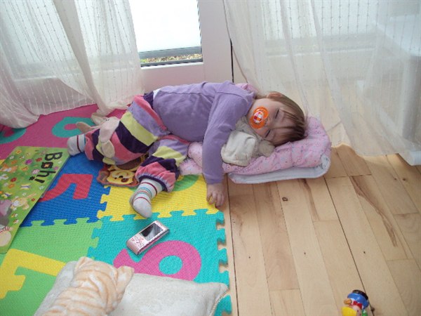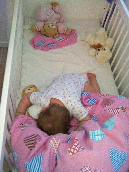 nåmen til jer der spurgte, så har jeg lige været inde og tage billeder af pigernes sovestillinger. først lilja, som er faldet i søvn forover, og så luca, som også er faldet i søvn forover men er tiltet til siden