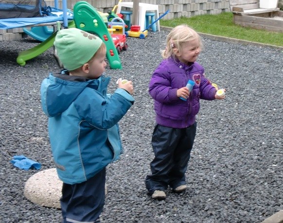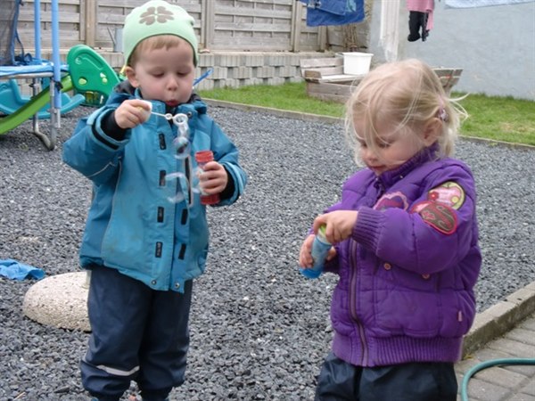 Foto 3 + 4 - Bianca hygger sig sammen med sin goé ven, Oliver. De puster sæbebobler sammen...