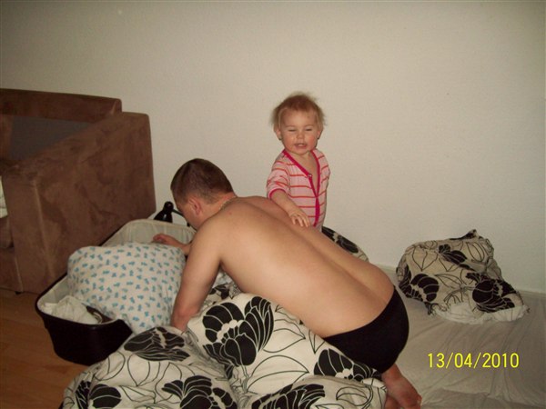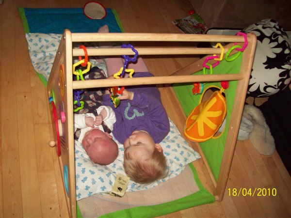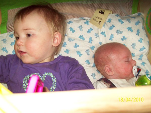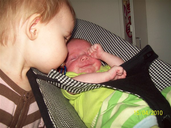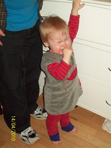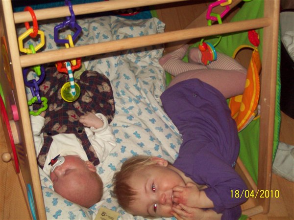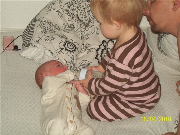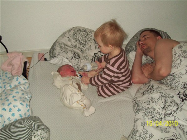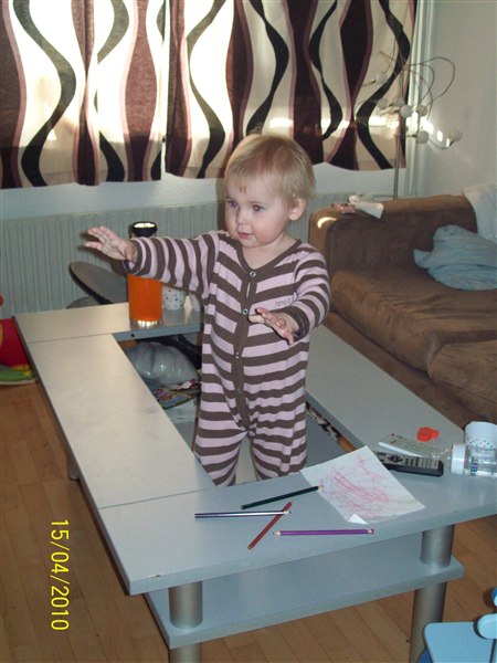 Cassandra ulykkelig fordi hun ikk måtte lege på puslebordet, giver lillebror mad, leger sammen med lillebror. Cassandra oppe i vores brod fordi glaspladen var fjernet, vi så det ikk.