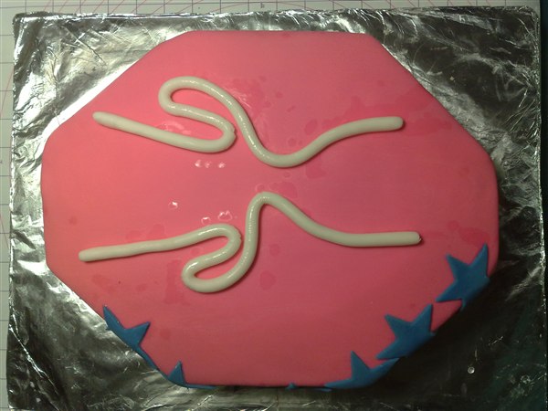 Jeg syntes den er blevet rigtig god. Desværre havde jeg taget lidt for meget mmf fra til stemmelæberne (logoet), så det pink-mmf kunne jeg simpelthen ikke rulle større ud, også stadig kunne sætte det på kagen