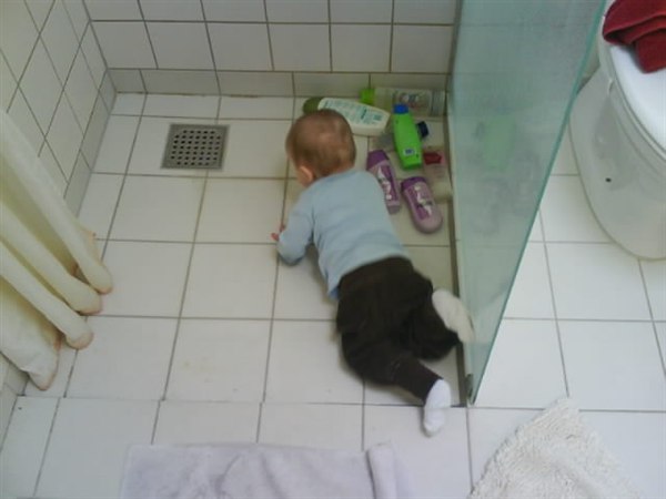 Jeg stod og vaskede sæben ud af håret da jeg pludselig hører klask-klask-klask. Kigger ned og ser at Silas har fået møffet sig ind under brusegardinet. Han har julelys i øjnene af at ligge og lege med vandet og jeg kunne altså ikke lade være med at grine.