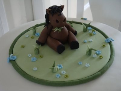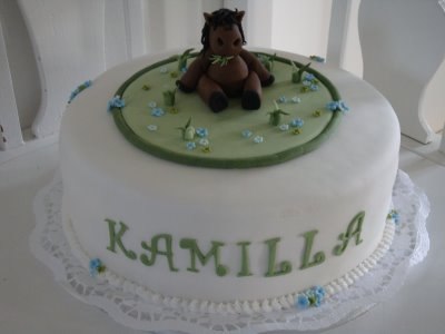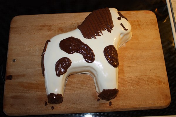 Min farmor lavede engang et hestehoved til min 10 års fødselsdag. Den var lavet i chokoladekage og pyntet med slik, karamelsnørre til hår, den brede lariksbånd som grime osv! Har desværre ikke noget billede af det.