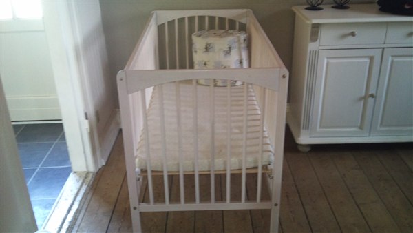 Tremmeseng i ludbehandlet fyretræ med madres og sengerand.