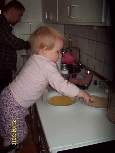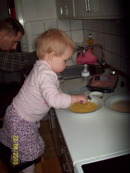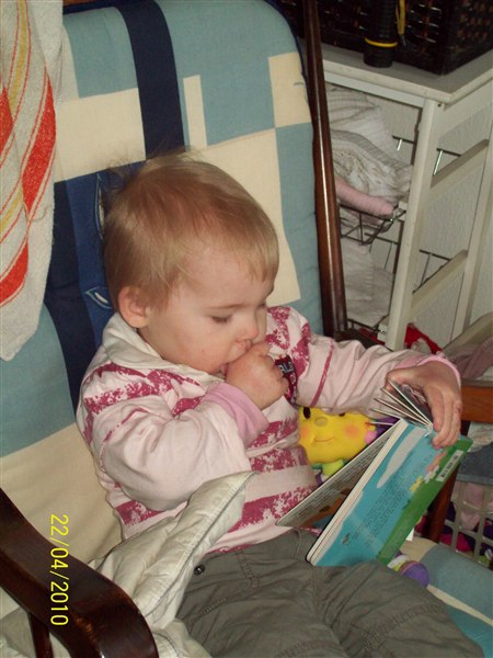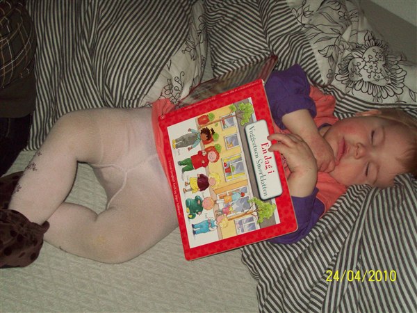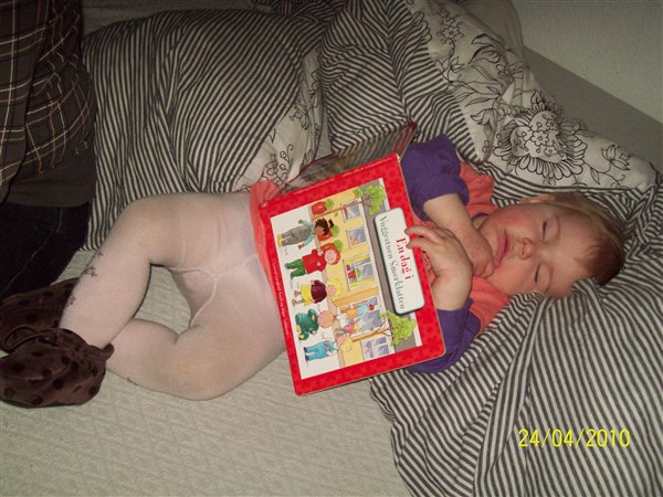Cassandra faldt i lige søvn med sin ynglingsbog, kravlede selv derop skulle lige læse og hjælper mor med at lave mad.