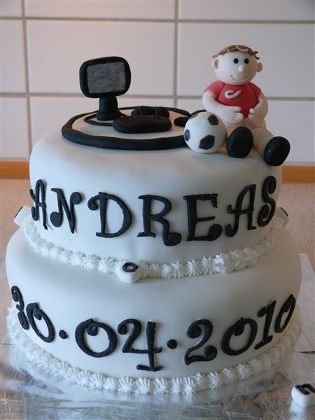 Så blev kagen afleveret til vores dagplejemor hvis store dreng skal konfirmeres i morgen! De eneste interesser er computer og fodbold så det skulle være med på kagen. Jeg er slet ikke tilfreds med fodbold drengen men det var første forsøg på at lave en figur af den slags så håber øvelse gør mester! Men de virkede helt tilfredse med den så det håber jeg de er!