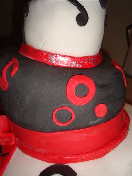 Synes det var en gang værre lort at lave for at sige det mildt... Jeg havde jo en ide om at den skulle være noget højere, hvilket den også var før der kom MMF på... Den dumhed jeg lavede var kun at bruge 3 bunde i hver etage og så masser af fyld... Det virkede som en god ide indtil MMF en skulle på. Jeg havde ikke taget højde for vægten af det, hvilket resulterede i at fyldet blev mast og kom ud igennem smørcremen og ætsede MMFen... Så måtte vente til den var tørret og så lægge et lag MMF mere på...