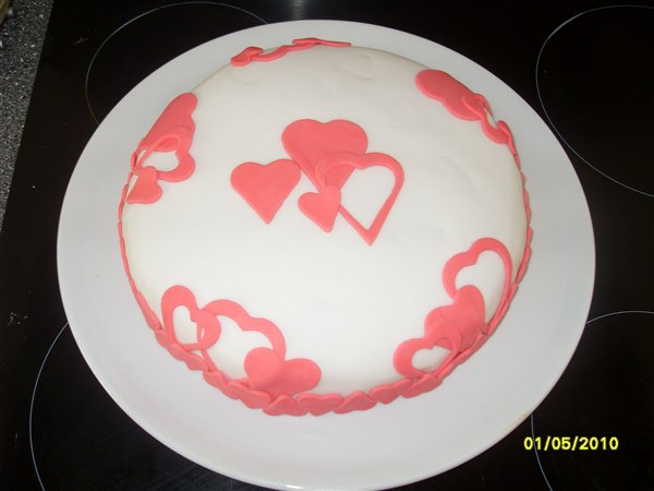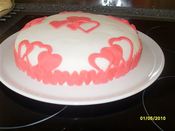 Kagen med hjerter på indeholder alm, kagecreme og jordbærsyltetøj...