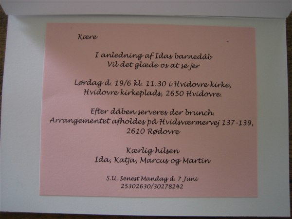 Lørdag den 19/6 skal Ida døbes i Hvidovre kirke. Vi har inviteret 78 gæster (64 voksne og 14 børn) og dertil har jeg lavet 35 invitationer. Jeg blev færdig igår og har fået dem sendt afsted idag.