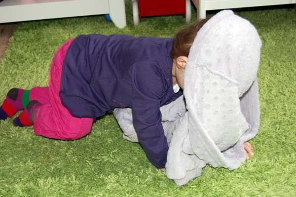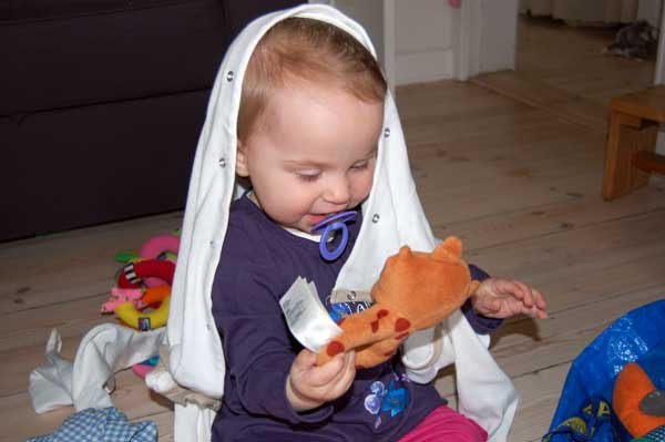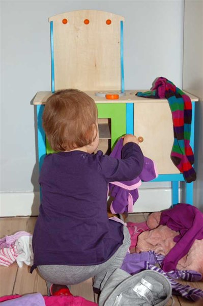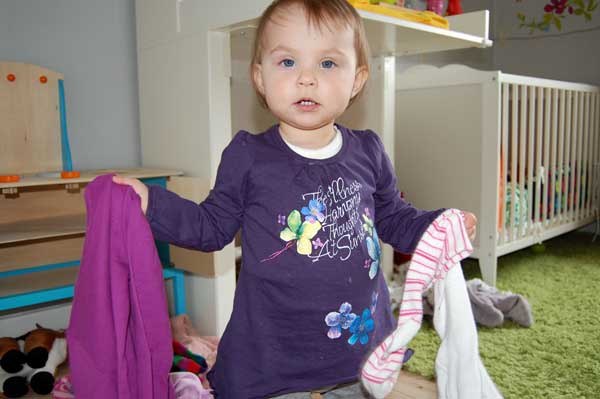 damen ordner tøj ... hiver det ud af skabet og nærstuderer hver enkelt del meget nøje. så putter hun det hele ind i skabene på legekøkkenet. ellers tager hun det på hovedet (tror hun prøver at tage det på) og kravler rundt med det, ofte uden at kunne se noget. og når hun kommer gående skal hun helst have et stykke tøj i hånden (eller på hovedet). hun kan bruge rigtig meget tid på det her og man må helst ikke forstyrre hende!