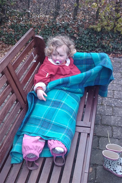 Da jeg så på et tidspunkt lige havde været inde, havde hun snuppet min plads, havde smidt gummistøvlerne og pakket sig ind i tæppet.