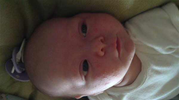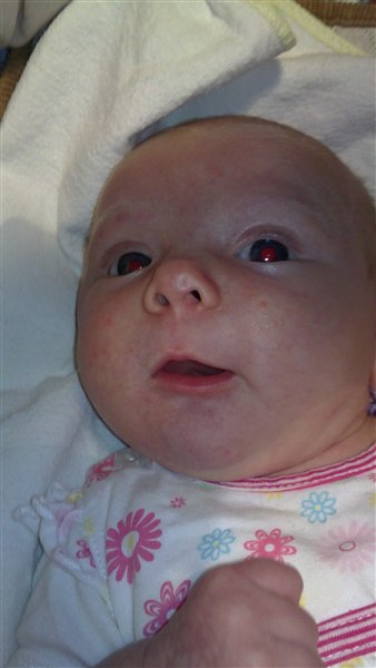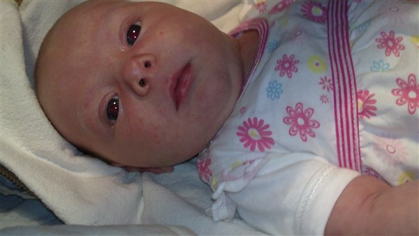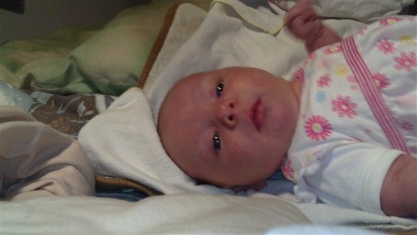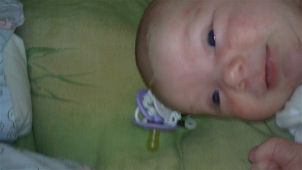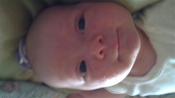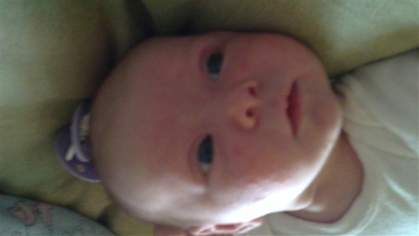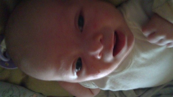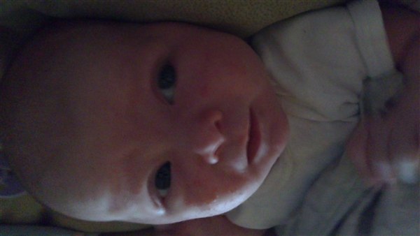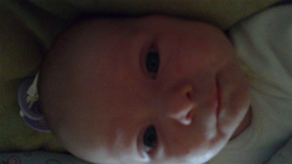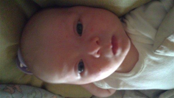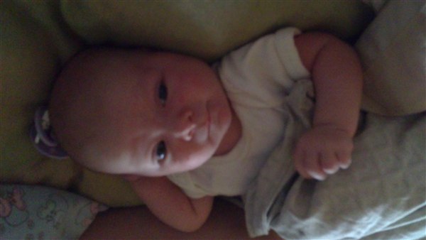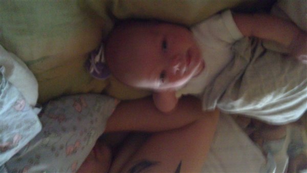 Lone H. skriver: Så blev Julie 1 månede i dag og det synes hun li hun skulle fejre ved at ligge og pludre og grine kl 3 i nat - Og li lidt billede fra weekenden og i dag
