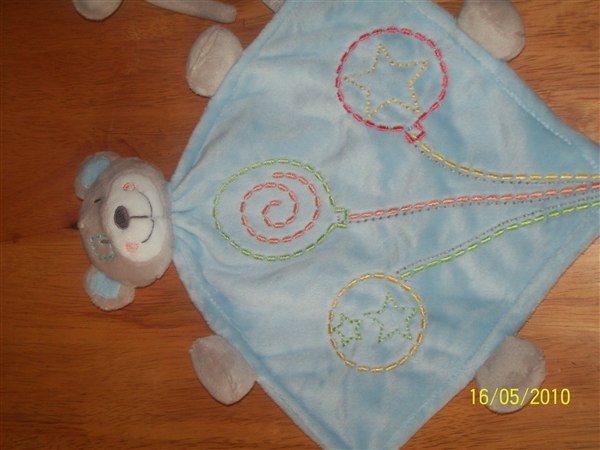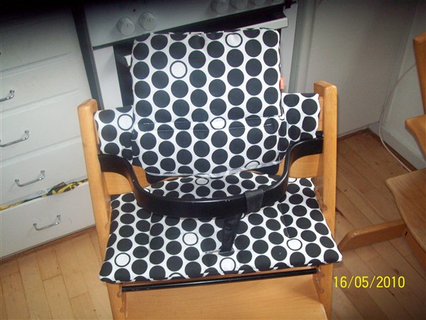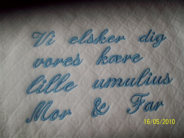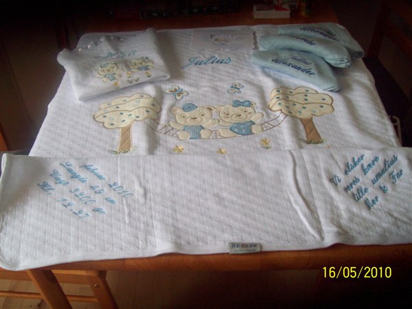 Et tæppe, pudebetræk og stofbleer af os.