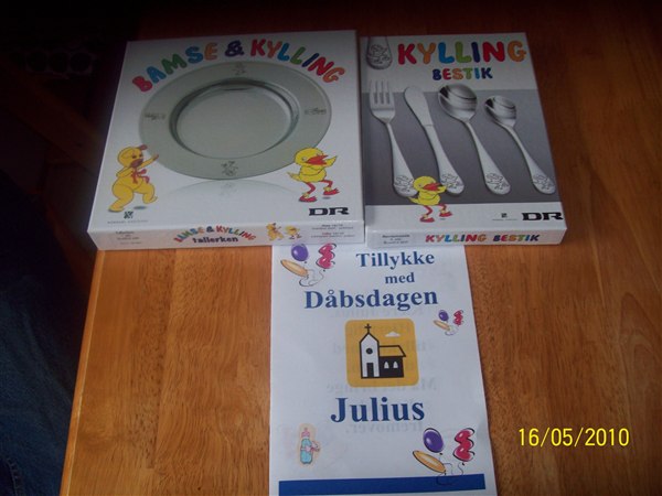 Sølv tallerken og bestik med Bamse og Kylling.