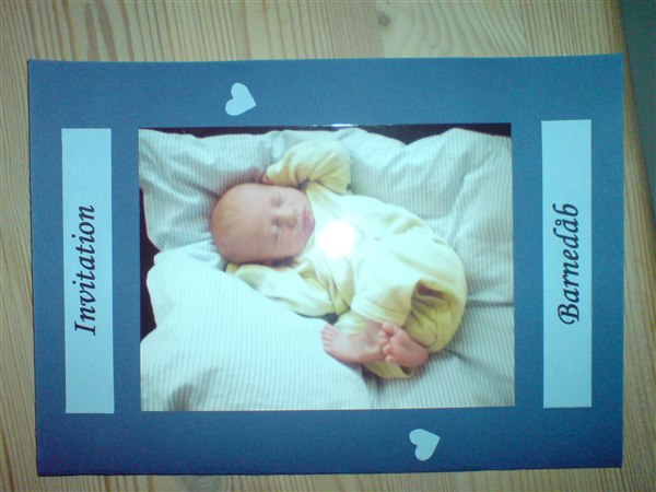 Jeg lavede også selv mine invitationer til både min dreng og min lille pige. Min søns var af samme princip som denne, bare med et andet billede og en blå sløjfe.