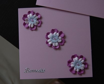 Tak tak Selve kortet er faktisk bare et foldet stykke A4 pap Så printede jeg "Invitation" og "Barnedåb" plus teksten indeni ud på lys lilla papir, klippede det ud og klistrede det på.. Hjerterne er stemplet ud med sådan en dims jeg fandt i Tiger til en 10'er Dem brugte jeg også til konfetti-pynt til bordet